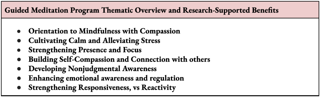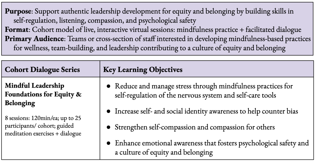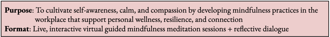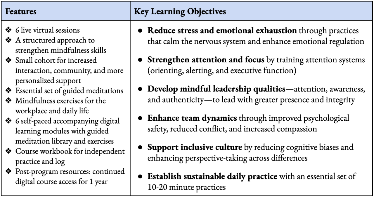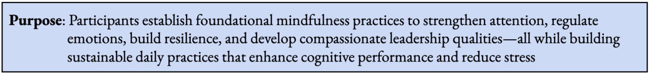 This comprehensive 6-week mindfulness training program integrates evidence-based mindfulness and compassion practices to address workplace stress, enhance leadership capacity, and support inclusive culture.
